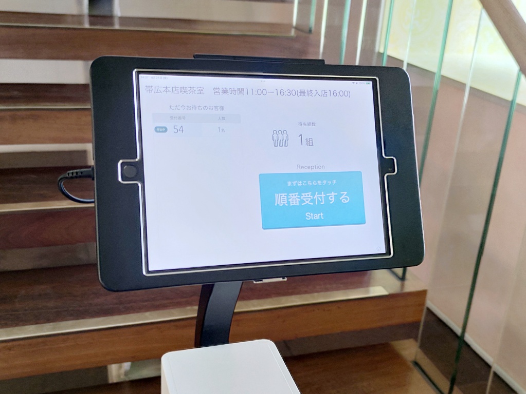 店内入ってまっすぐ進むと階段があって、手前に受付の機械があるのでそれで発券します。すぐそばに待機用の椅子も用意されています。番号がアナウンスされたら2階へあがります。