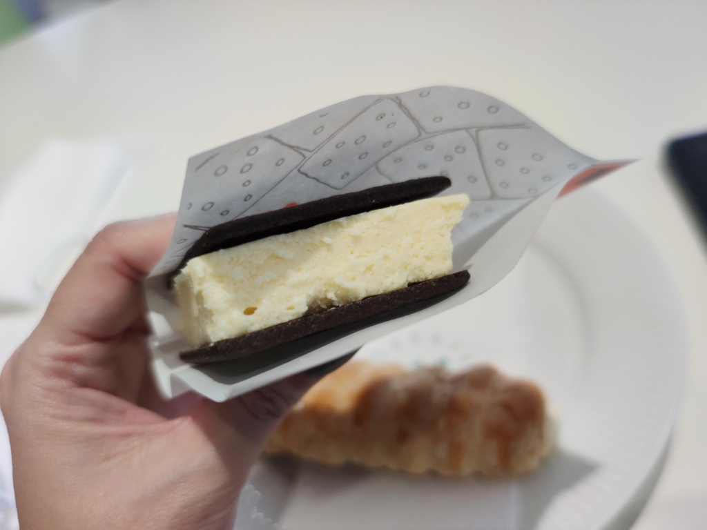 雪やこんこが大好きなので、雪こんチーズ(280円)が大好きです。簡単に言って雪やこんこの拡大版です(笑) 雪やこんこのビスケットで、注文を受けてからチーズクリームを挟んだもので、チーズクリームは厚さ1.5cmぐらい。少しひんやり。賞味期限が2時間!帯広店以外でも食べられるのですが、大好きなので注文しました。小ぶりなので好きな人は2~3個食べちゃいそうです。