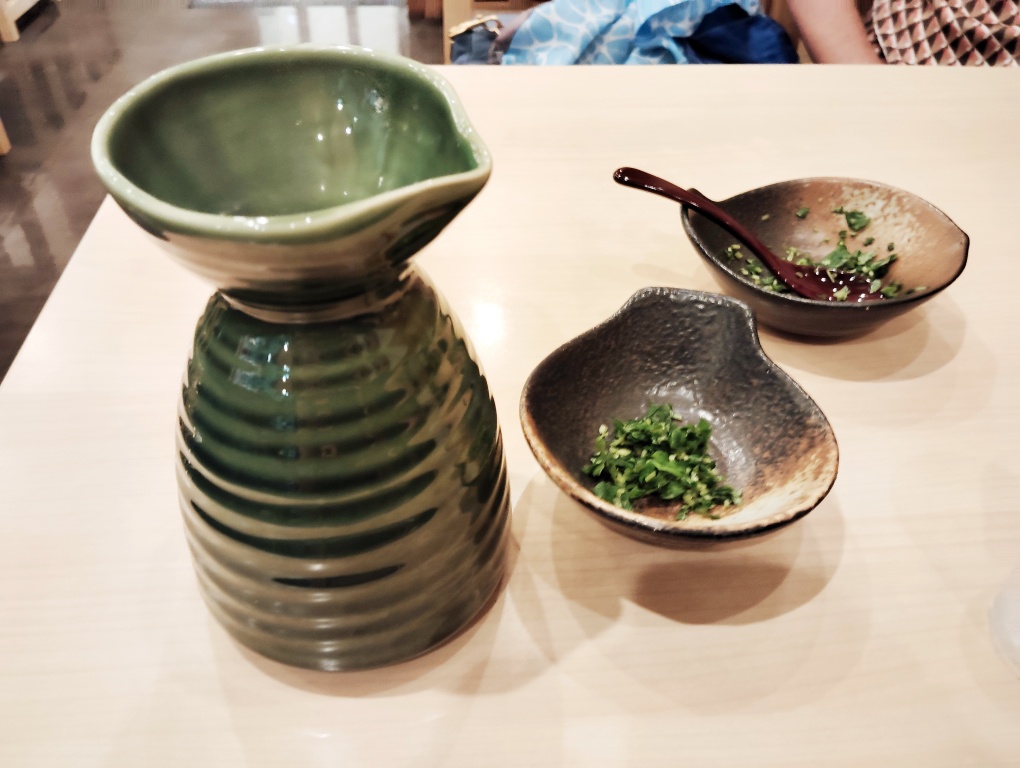 注文したのは特別玉子焼(1,050円)です。玉子焼が出来上がるころになると、こちらのだしと薬味セットが卓上にでーん!と置かれました。徳利はちょっと熱いです(*’ω’*)