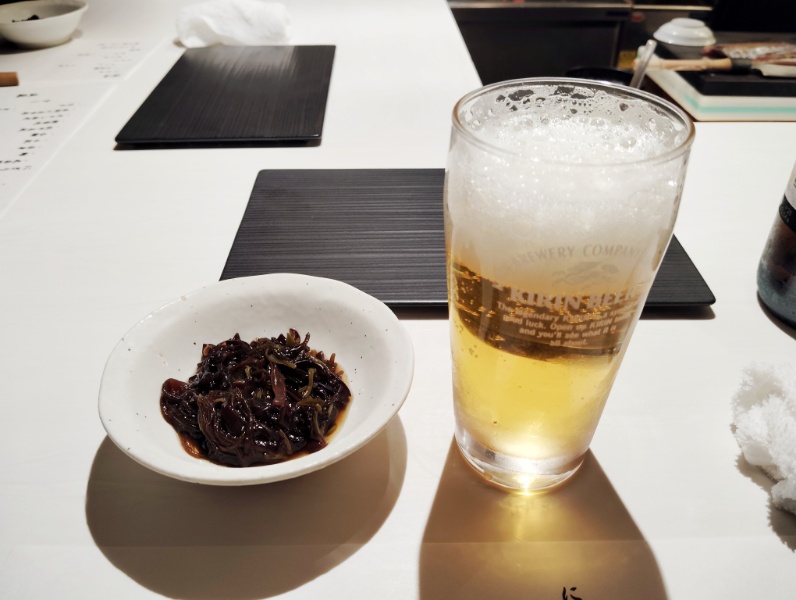 この日は我々4人を含めて8席でした。席につくなり瓶ビールを注文。全員揃うまでお酒を飲みながらワイワイ。全員揃ったところで、お通しのきくらげが出てきました。