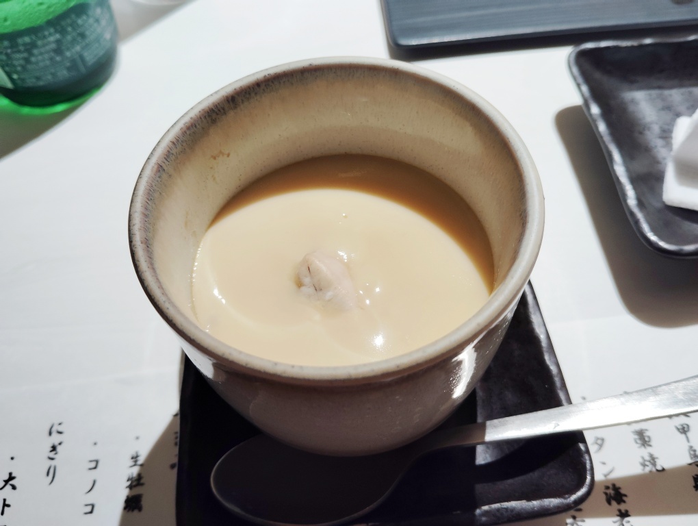続いて茶わん蒸し。白子の茶わん蒸し。何の白子だったか失念してしまいました。鱈でもふぐでもない・・・。見た目はふぐの白子に似ていました。