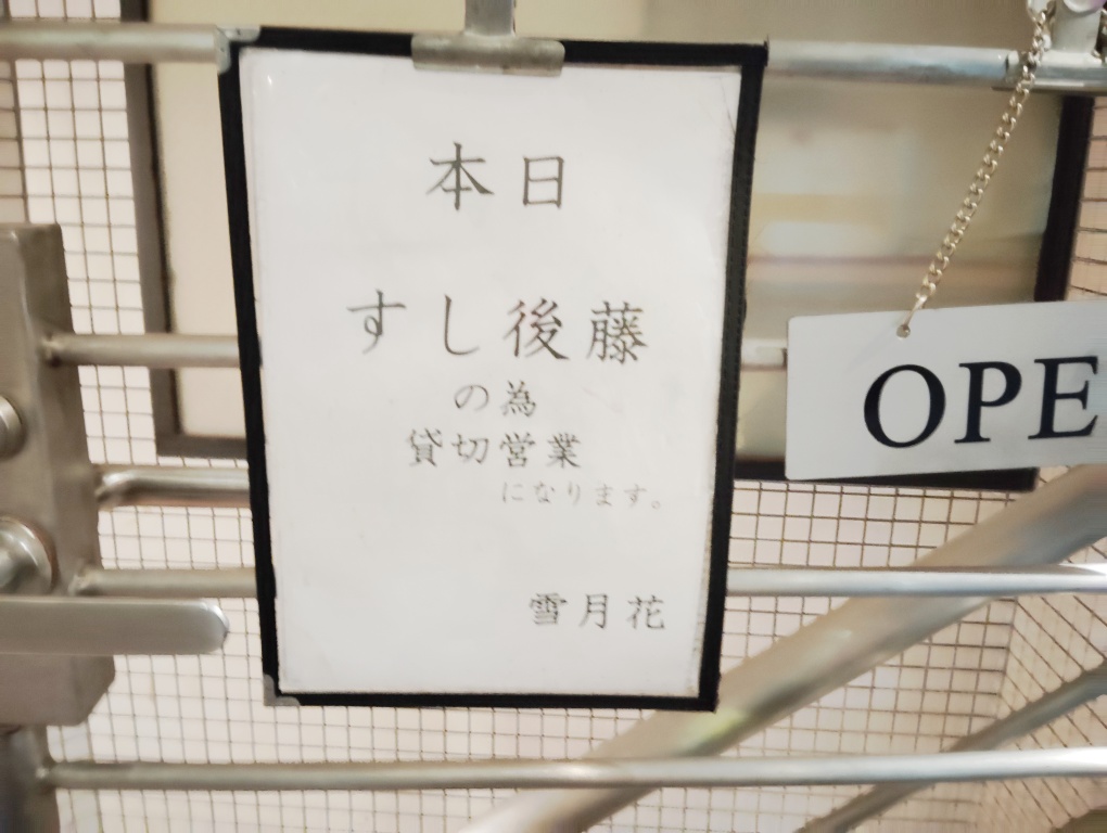 久しぶりに五反田のすし後藤のお誘いをいただいたんで、ウキウキで行ってきました!すし後藤・・・そんな店あったっけ?イエイエ。すし後藤というのは、雪月花が不定期で開いているカウンターのみのお寿司営業。