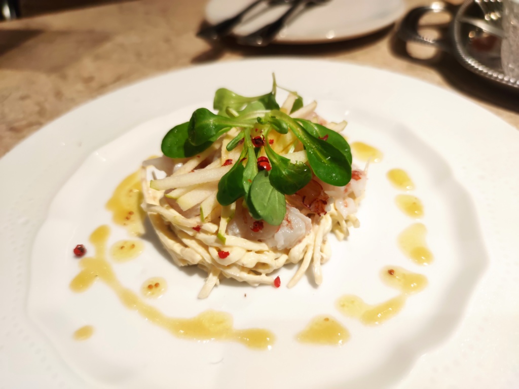 赤エビのタルタル 根セロリ・りんごのレムラード