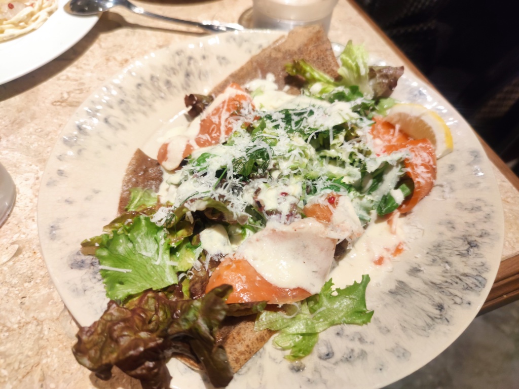 これ私のチョイス(笑) やっぱり食べたいガレット。ガレット・ノルマンディー(2,300円)。そば粉のガレットの上にはこんもりとサラダとサーモン、ノルマンディー風クリームソースがかかって、サラダ感覚で食べられるガレットでした。ガレット自体はモチモチとしていました。