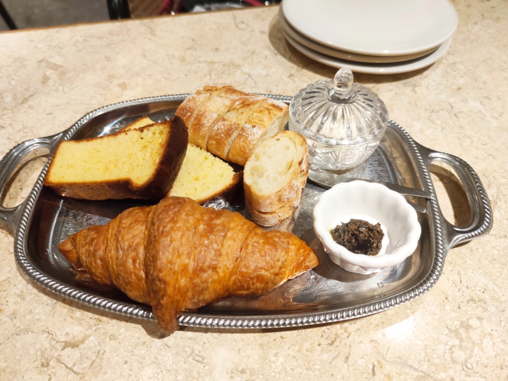 TOOTH TOOTHはパンがおいしいとリサーチしていた友人。というわけで、メニューにあったパン3つをオーダー。バケット・コカ(400円)、ブリオッシュ・リュクス(450円)、クロワッサン(500円)。結構ボリューミー(笑) どれもサクサクで、バターたっぷりな味。