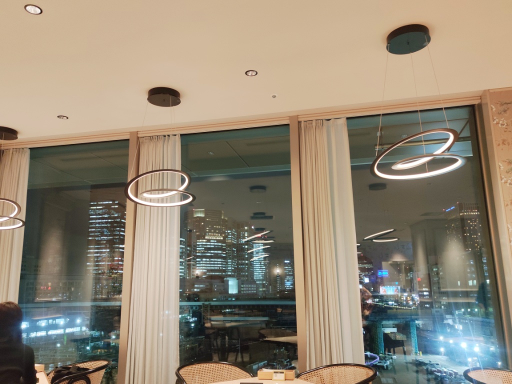そして、夜景が一望できる窓際席!ここは予約優先のようです。私たちも予約していったので、最前列ではないけれど、こうした夜景が良く見える席でした。