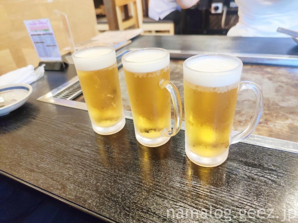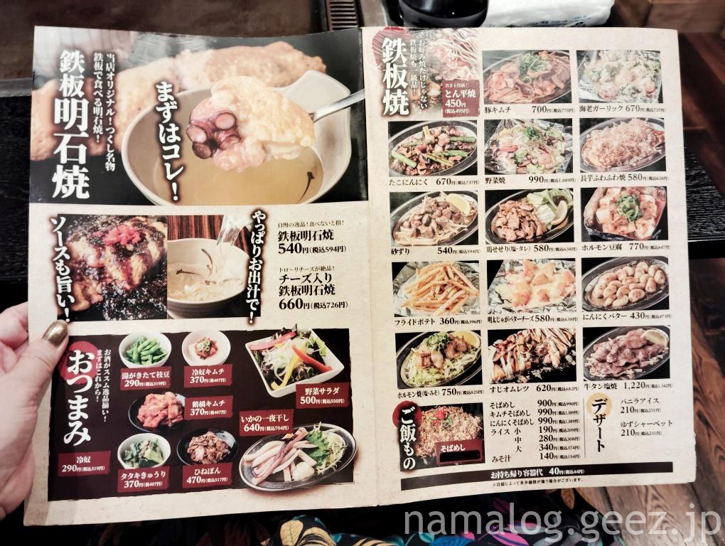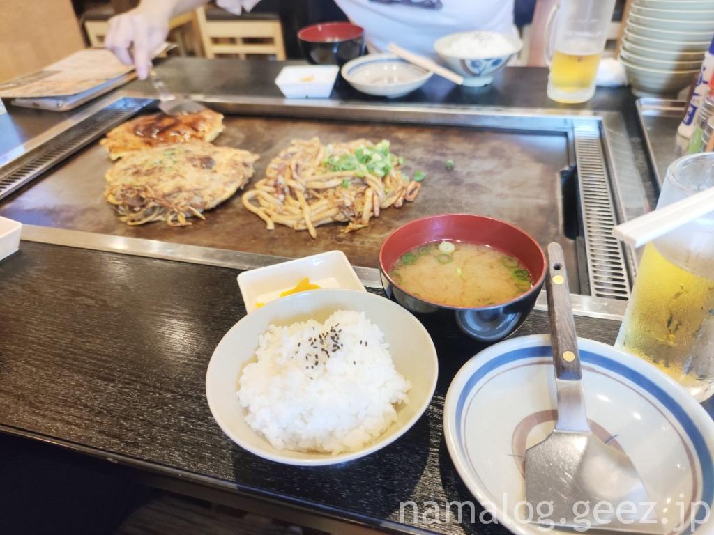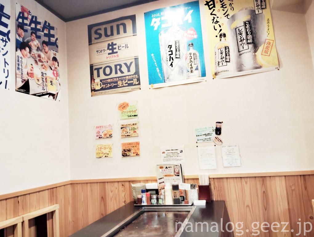 店内は4人掛けのテーブル席と6人ぐらいまで座れそうな小あがりで構成されています。どのテーブルにも鉄板。お好み焼きや麺類は厨房で作られた後、運ばれてきて、この鉄板の上に置かれます。