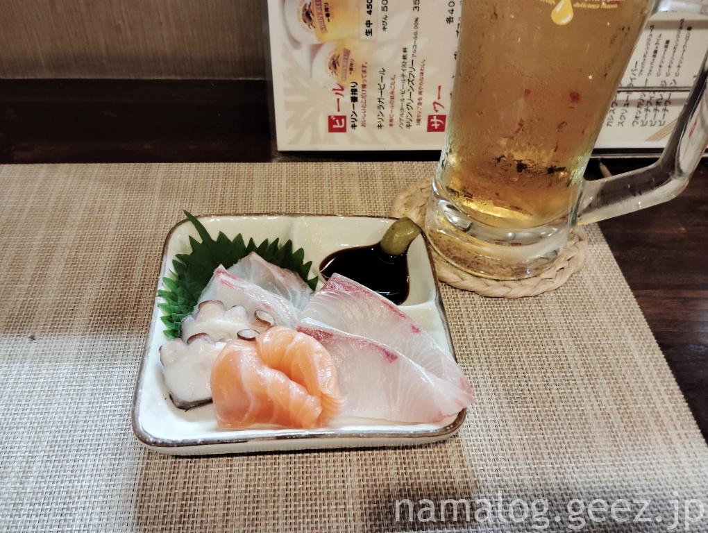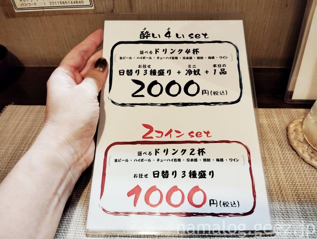 その代わり、酔い4いsetや2コインセットというリーズナブルなセットが用意されてます。ドリンク2杯と日替わり3種盛りで税込み1,000円というのはとてもお安い。しかしながら、その盛り合わせはちょっとした煮物で(おいしそうではあるものの)、観光客である私がここまで来て食べるような感じではなく、地元の人がお得に飲むためのものかな、という感じでした。