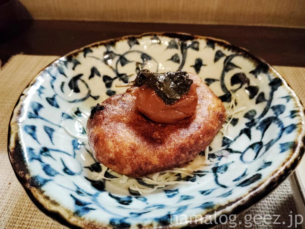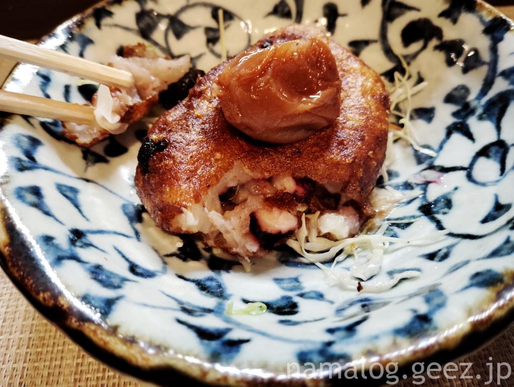 メニューを見ていて気になったのがタコと里芋のふあとろ揚げ(600円)。ふわとろ、じゃなくてふあとろですよ。心が躍りますね。たこやきみたいに丸いのが2~3個来るのかな?と想像していたんですけど、ハンバーグみたいな感じできました。千切りキャベツの上に載ってます。一番上にははちみつ漬けの梅干し。