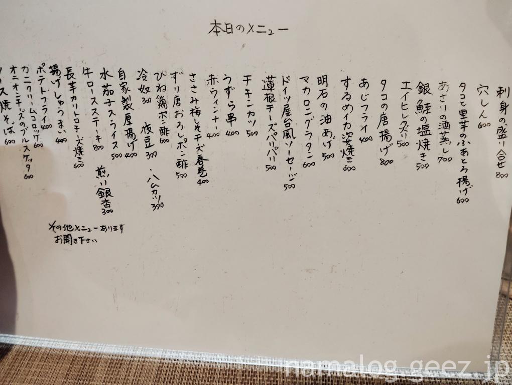 こちらがフードメニュー。縦書き。魚介、野菜、肉など一通り。明石らしく、タコ料理もあります。