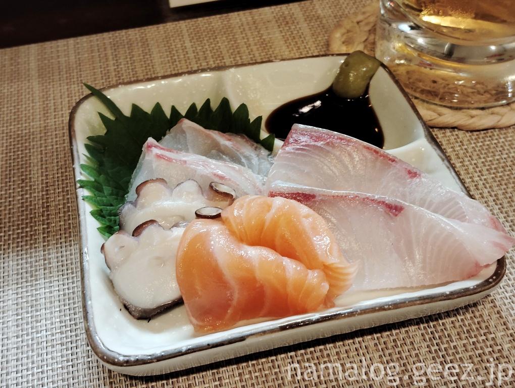 というわけで、観光客は観光客らしく、まずは刺身盛り合わせ(800円)ですよ(笑)キンキン冷え冷えのビールとともにいただきました。