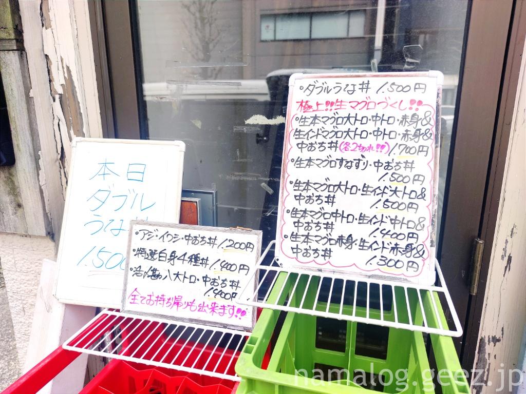 その日のランチメニューは、外のホワイトボードにあります。基本的にすべて丼です。そして見ての通り、鮪推しです