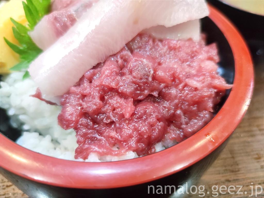 まぐろ以外も食べたかったので、活〆勘八大トロ・中おち丼(1,400円)にしました。待っている間に注文をしていたので、席につくとすぐに出てきました。丼の他にお味噌汁がつきます。