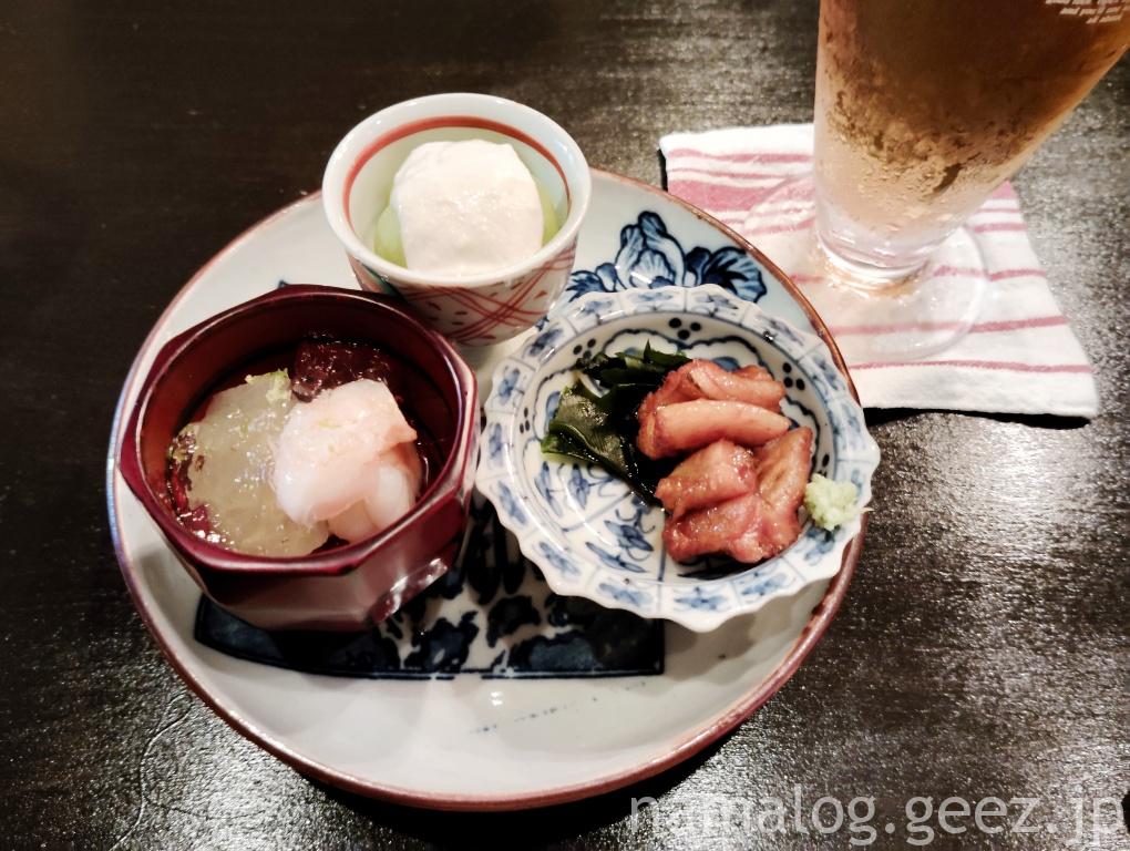 まずは前菜3種。シャインマスカットの白和え、冬瓜と海老の炊き合わせ、穴子。本当は穴子ではなく金平牛蒡だったんですけど、家に置いてきてしまったということで(笑)、急遽穴子になりました( *´艸`) でもこの穴子が味付けが甘さ控えめでちょうどよくとてもおいしかったです。炊き合わせもジュレがさわやか。