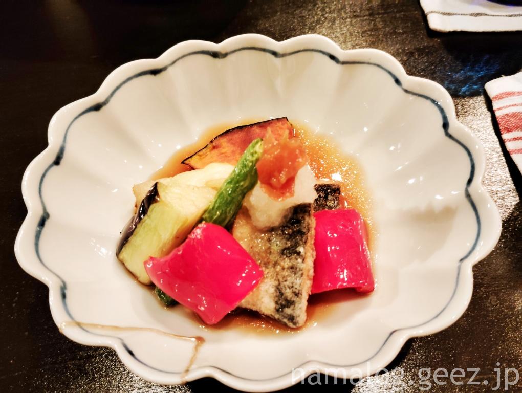 新さんまと秋野菜の梅おろし揚げ。秋刀魚のうまみを吸った茄子のおいしいこと!実はこれが今シーズン初秋刀魚でした!