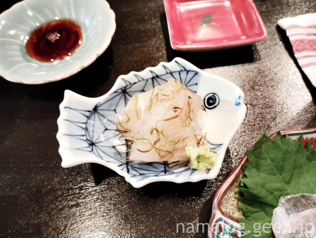 鯛ですね。こちらは昆布〆になっていて少し熟成させたようなねっとりとした質感。お皿がかわいい。