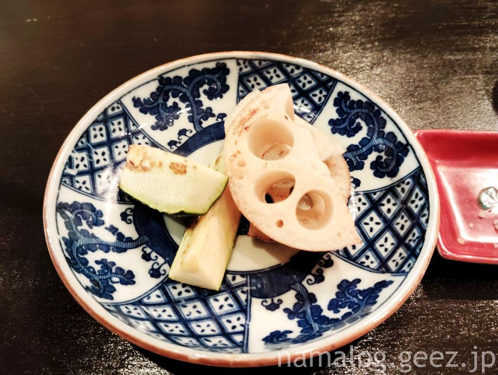 旬の焼き野菜。新レンコンとズッキーニ。すだちや塩も用意されているけれど・・・