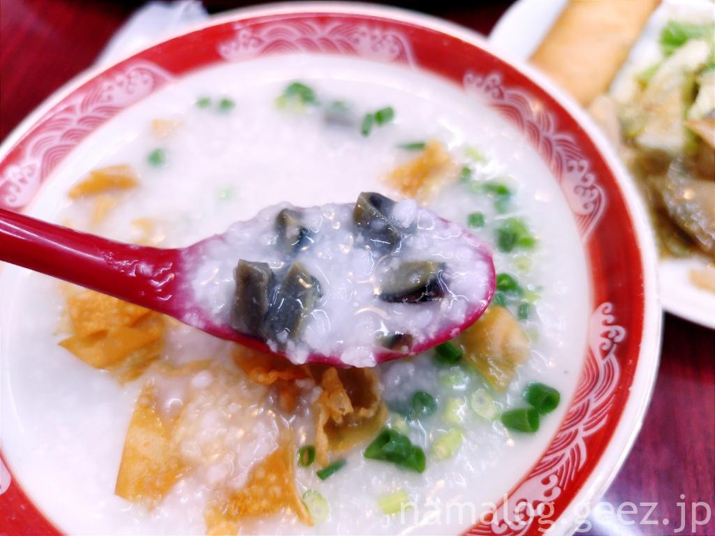 ここのおかゆは上で紹介した謝甜記とはうってかわってしっかり塩味。味が濃い目です。お粥だけの注文もできるけれど、セットはお得。写真は皮蛋粥セット(990円)だったんですけど、皮蛋1個分入ってるんじゃないかっていうくらい皮蛋がゴロゴロいました。他にデザートもつきます。